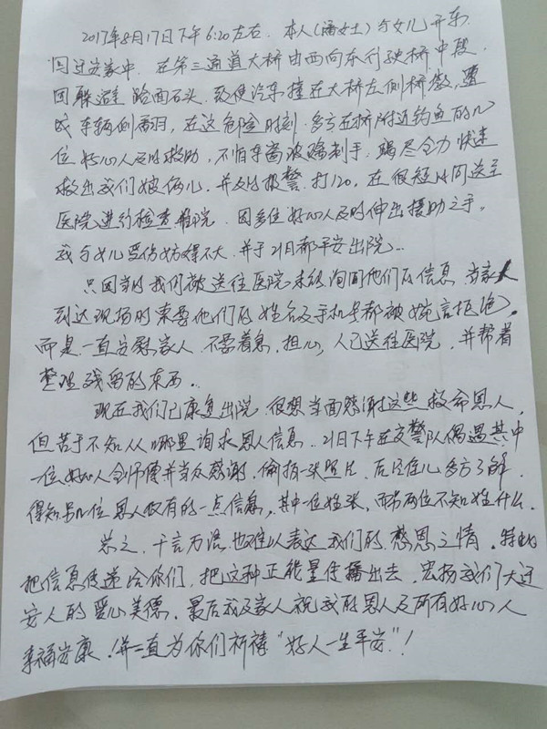 “21日下午在交警大队偶遇了其中一位好心人全先生,实现了我当面感谢的愿望,但是另外几位恩人,只是知道很少的一点信息,知道其中一位姓张,其他两位就不知道了”,难以表达感激之情,潘女士手写感谢信,并联系到信息港编辑部,希望将满满的正能量传递出去,更希望几位热心人感受到她由衷的谢意。