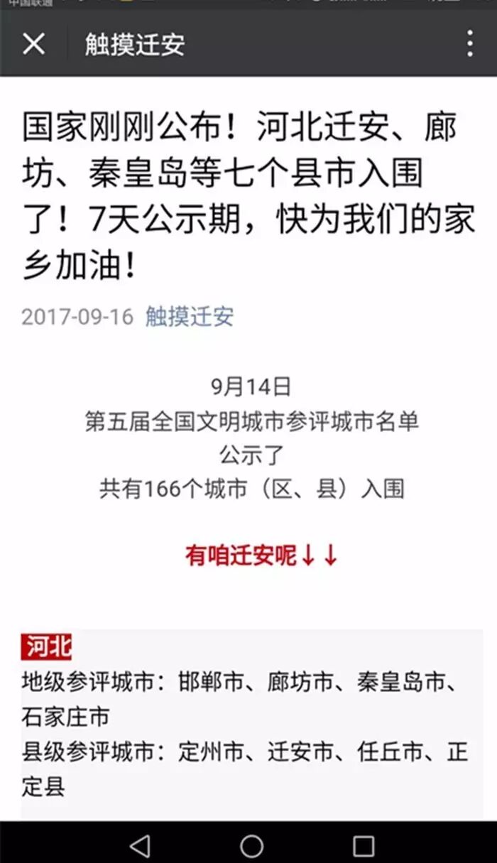 从9月16日开始,迁安市民的朋友圈被某微信公众平台发布的《国家刚刚公布!河北迁安、廊坊、秦皇岛等七个县市入围了!7天公示期,快为我们的家乡加油!》刷屏了,为了助力迁安争创全国文明城市,热心的迁安市民纷纷转发、投票,仅仅一天时间,该篇文章的阅读量突破十万,但是很多市民却全然不知,自己的热心被利用,成为该公众号博取眼球、引导关注的“良方”。