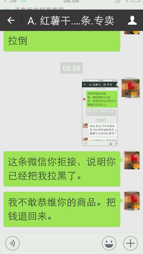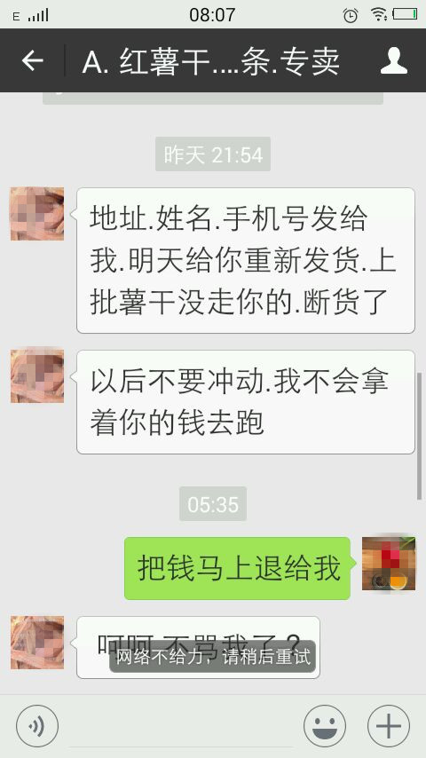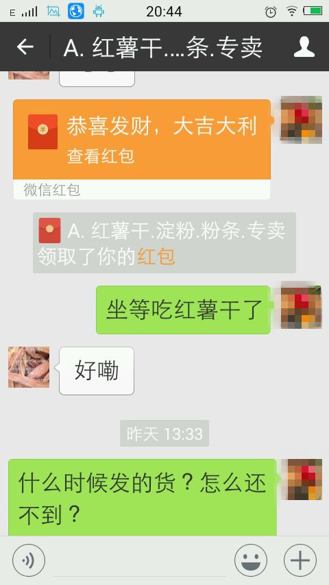 张先生的帖子发布之后,不少市民回帖表示,也曾购买相同微信号卖家的红薯干,收到的红薯干却是长毛的,也不能吃。10月6日晚,在看到张先生发帖后,卖家通过微信联系上张先生,表示:“明天会给你重新发货,上一批红薯干断货了”,在张先生要求退钱后,卖家并没有退还红包,也无进一步说明。