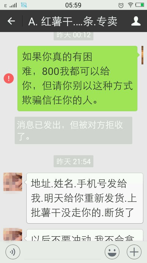 据迁安吧友张先生(化名)称,10月1日,他在百度迁安吧联系上一位自称是卢龙的专卖红薯干的人员,并添加了此人的微信。通过微信沟通,张先生向其支付了80元红包购买红薯干,对方称当天无法发货,等2号才能发货,但是让张先生郁闷的是,4号也不见快递,就再次发微信与卖家联系,但却没有回音。10月5日,张先生再次联系卖家,不想却已被屏蔽,打电话也无人接听。“从卢龙到迁安也没多远,都好几天了还没音信”,张先生深觉被骗,于是将个人遭遇发布到了迁安吧,希望借自身经历提醒广大市民朋友不要上当被骗。