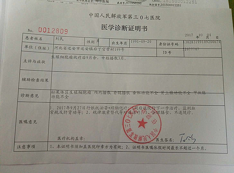 迁安后丁村26岁刘民身患生殖细胞瘤 年轻生命急需社会救助