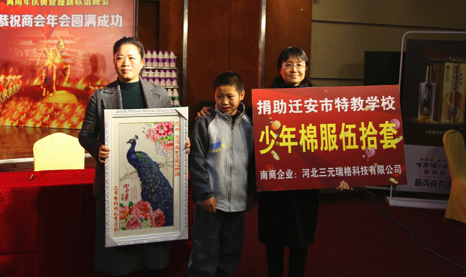 会上,唐山市南安商会迁安分会与中信保诚人寿唐山支公司进行了合作联盟签约仪式,商会会员企业河北三元瑞格科技有限公司向市特教学校捐赠50套价值15000元棉服。