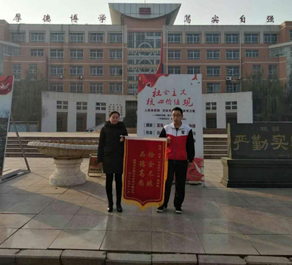 确认后,杨海峰把包交给了失主,失主从包里拿出现金作为酬谢,被杨海峰谢绝了。11月21日,为表感谢,杨女士代表公司将锦旗送到杨海峰手中,以此向拾金不昧的杨海峰同学表示感谢。