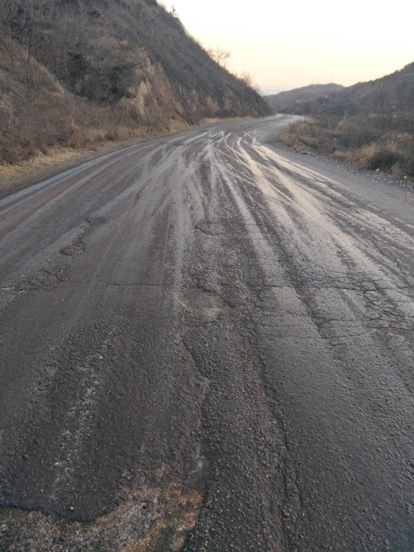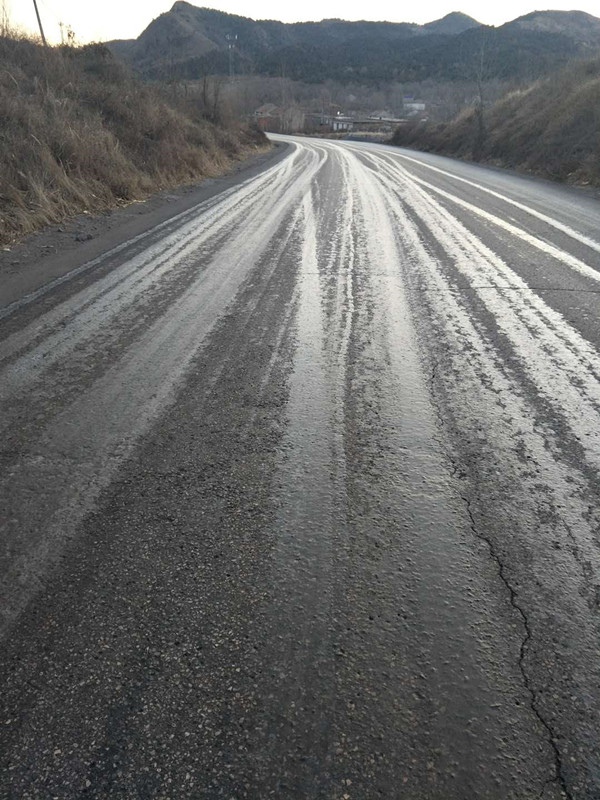 “今天早上我不到七点出门,看到一位骑电动车的在这里摔倒了”,赵先生讲述,迁安市木厂口镇红石峪村和太平庄乡三岔峪村的交界处是一段坡路,在此路段,结冰情况最为严重,“由于离钢厂较近,这里经常有大车经过,尤其是晚上,大车更多,这些大车有些是装满水渣的,晚上水渣中的水滴落在路面上,很快结成冰,由于这里是坡路,车辆行驶速度可能比较慢,所以滴落的水更多,结冰情况也更严重”,赵先生讲述,在此路段,大概有两三百米,路面上都是薄薄的冰层,十分光滑,存在极大的安全隐患。